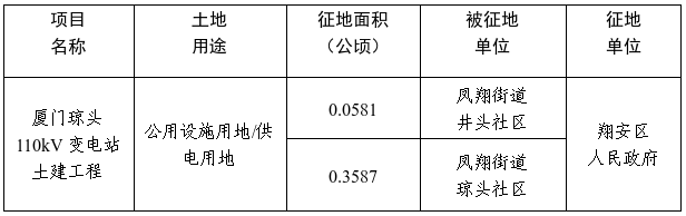 厦门市翔安区人民政府关于厦门琼头110kV变电站土建工程项目土地征收的公告