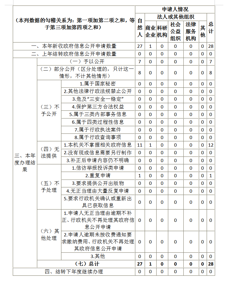 2025年我局受理自然人提出的政府信息公开申请27件,商业企业提出的政府信息公开申请1件。其中无法提供(本机关不掌握相关政府信息)12件,予以公开7件,部分公开8件,重复申请1件,均在法定时限内予以答复。因政府信息公开收到行政诉讼1件,尚未审结。