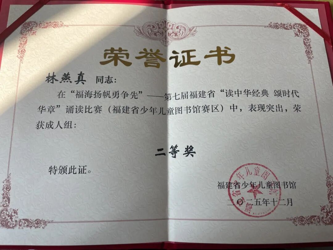 近日,在“福海扬帆勇争先——第七届福建省‘读中华经典 颂时代华章’诵读比赛”中,厦门市翔安区马巷中心小学林燕真老师荣获二等奖。