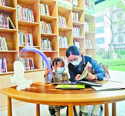 国贸学原邻里书屋里,一对母女共读图书。 (邵凌丰 摄)