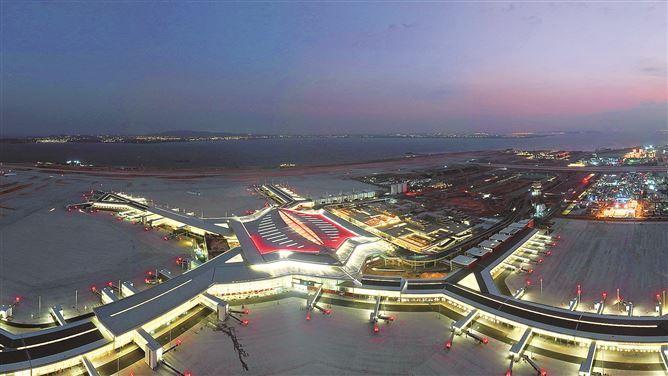 光影勾勒出的航站楼恰似一座壮观的海上大厝。