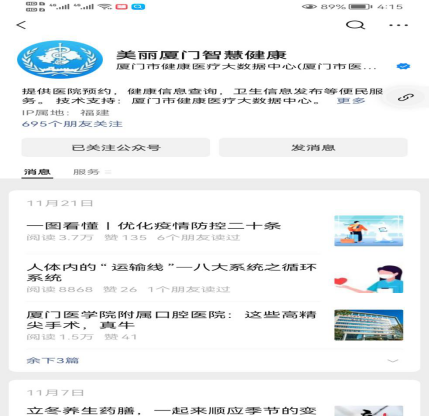 微信用户可关注“美丽厦门智慧健康”微信公众号,进入公众号界面后,进入“预约导诊”界面,可选择“医院预约”或“社区预约”,点击“医院预约”可进入厦门市各大医院门诊预约界面,然后选择科室及医院进行预约;点击“社区预约”可进入厦门市各区社区卫生服务中心或者卫生院门诊预约界面,然后选择科室及医生进行预约。