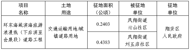 根据《中华人民共和国土地管理法》《中华人民共和国土地管理法实施条例》《厦门市集体土地征收与补偿若干规定》等有关规定,经《福建省人民政府关于翔安区2025年度第五十一批次农用地转用和土地征收的批复》(闽政地厦〔2025〕137号)批准,需征收翔安区凤翔街道垵山、刘五店社区集体土地0.6786公顷,作为环东海域滨海旅游浪漫线(下后滨至会展段)道路工程项目用地。现将有关事项公告如下。