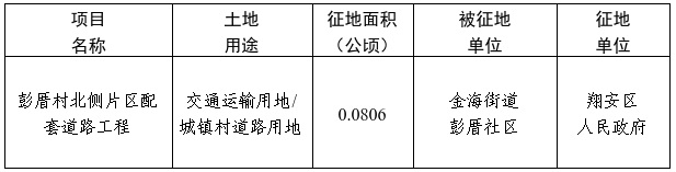 厦门市翔安区人民政府关于彭厝村北侧片区配套道路工程项目土地征收的公告