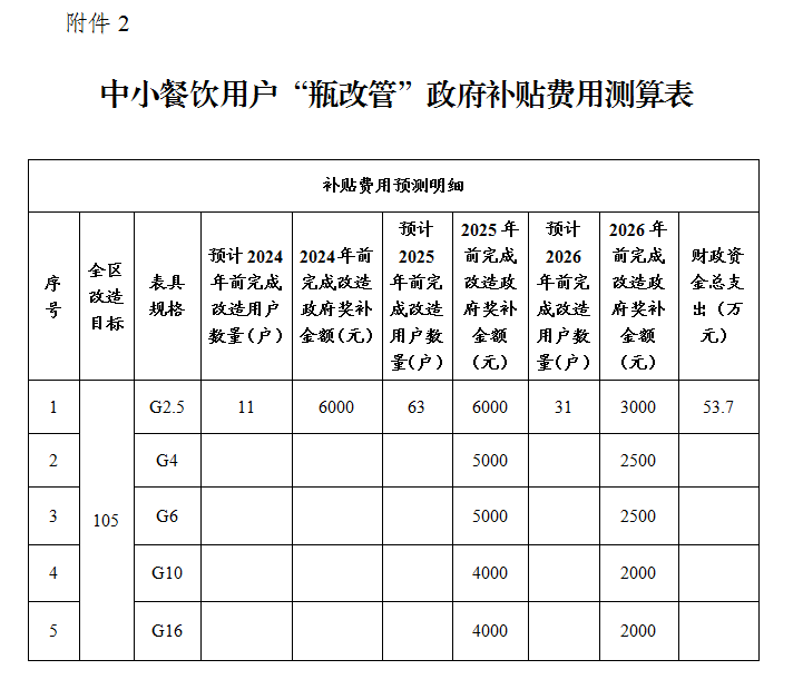 2.中小餐饮用户“瓶改管”政府补贴费用测算表