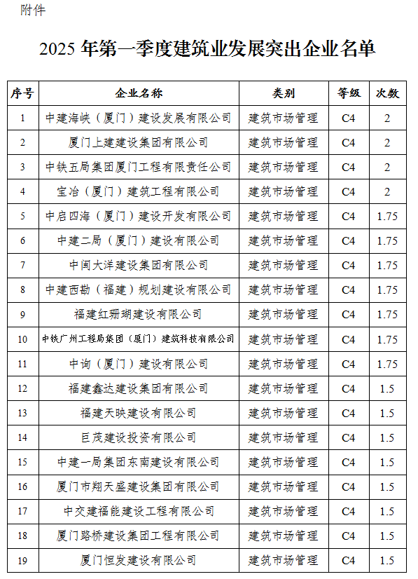 厦门市翔安区住建和交通局关于对2025年第一季度建筑业发展突出企业予以通报表扬的通知