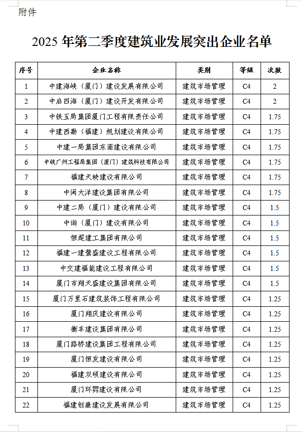 厦门市翔安区住建和交通局关于对2025年第二季度建筑业发展突出企业予以通报表扬的通知