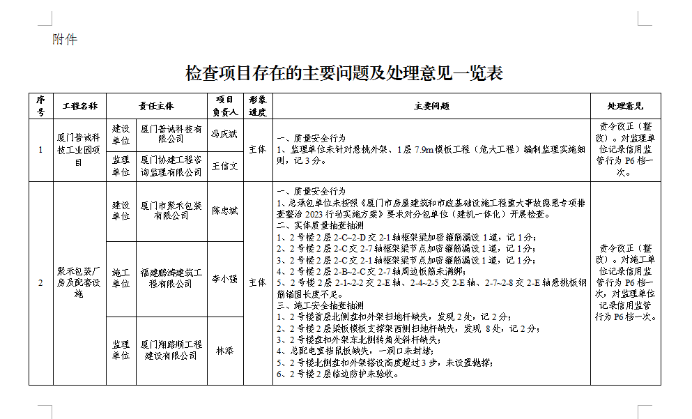 对聚禾包装厂房及配套设施施工单位福建鹏涛建筑工程有限公司责令改正(整改),记录信用监管行为P6档(社会责任)一次;对该项目监理单位厦门翔路顺工程建设有限公司责令改正(整改),记录信用监管行为P6档(社会责任)一次。