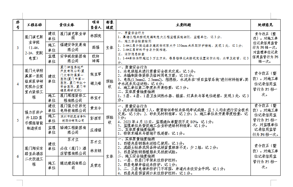 对厦门演艺职业学院(1-4#、2-1#、变配电室)施工单位福建安华发展有限公司责令改正(整改),记录信用监管行为P6档(安全生产管理)一次;对该项目监理单位安华城投集团有限公司责令改正(整改),记录信用监管行为P6档(安全生产管理)一次。