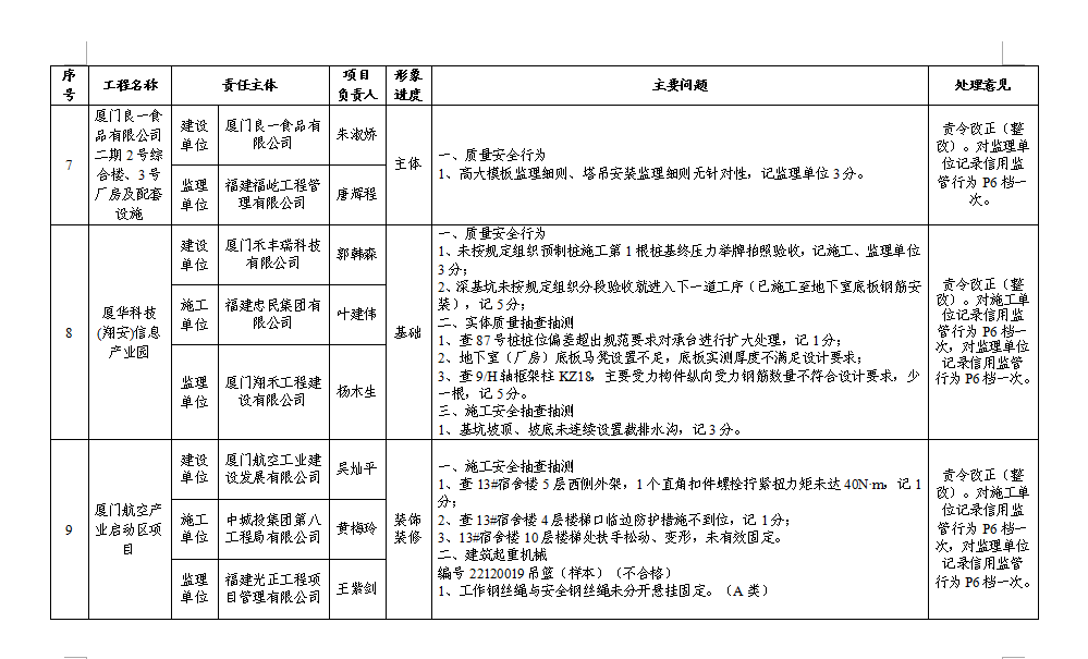对厦华科技(翔安)信息产业园施工单位福建忠民集团有限公司责令改正(整改),记录信用监管行为P6档(安全生产管理)一次;对该项目监理单位厦门翔禾工程建设有限公司责令改正(整改),记录信用监管行为P6档(安全生产管理)一次。