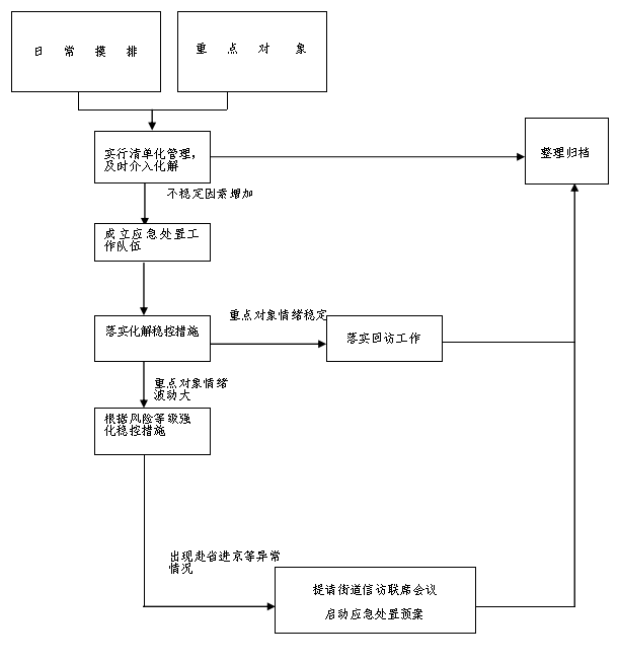 (一)处置组织。成立重点人员处置小组,全力以赴做好重点人员稳控工作:协调组由包社区领导负责,协调联系上级部门和街道相关部门。稳控组由包社区组长负责,做好重点人员及其亲属的稳控工作,了解其生活动态。