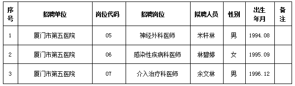 根据《厦门市第五医院公开招聘普通高等院校2023届优秀毕业生简章(2023年5月)》的要求,现将已通过面试、体检、考察等程序的第一批拟聘用人员名单公示如下: