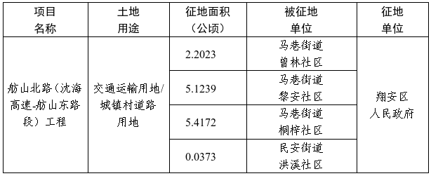根据《中华人民共和国土地管理法》《中华人民共和国土地管理法实施条例》《厦门市集体土地征收与补偿若干规定》等有关规定,经《福建省人民政府关于翔安区2025年度第六批次农用地转用和土地征收的批复》(闽政地厦〔2025〕46号)批准,需征收翔安区马巷街道曾林、黎安、桐梓社区、民安街道洪溪社区集体土地12.7807公顷,作为舫山北路(沈海高速-舫山东路段)工程项目用地。现将有关事项公告如下: