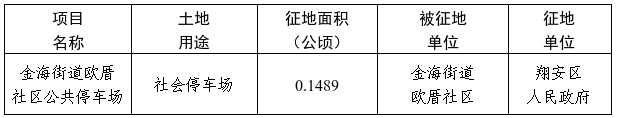 厦门市翔安区人民政府关于金海街道欧厝社区公共停车场项目土地征收的公告