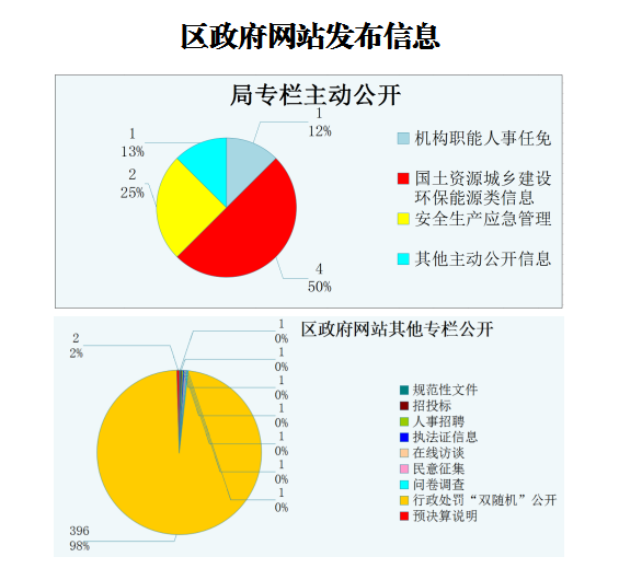 2022年,我局通过区政府网站本局专栏主动公开政府文件8条,其中,机构职能人事任免1条、城市综合执法(国土资源城乡建设环保能源类)4条、安全生产应急管理2条、其他类信息1条。在区政府网站其他专栏发布各类信息动态405条(规范性文件1条、“双随机、一公开”项目数396条、人事招聘1条、招投标1条、预决算说明2条、执法证信息1条、在线访谈1条、民意征集1条、问卷调查1条)。