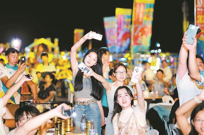 暮色初临之际,1.3万平方米的商街上流光溢彩,音浪舞台区成为全场的焦点。多个专业乐队轮番助阵,多元节目满足不同年龄段市民的喜好;舞台下,年轻人举杯畅饮,亲子游客在主办方设置的休憩区共享海风轻拂的惬意舞台时光。