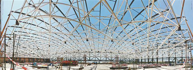 ■宽体机库近2100吨网架整体上升近26.5米 ■项目预计明年具备投用条件