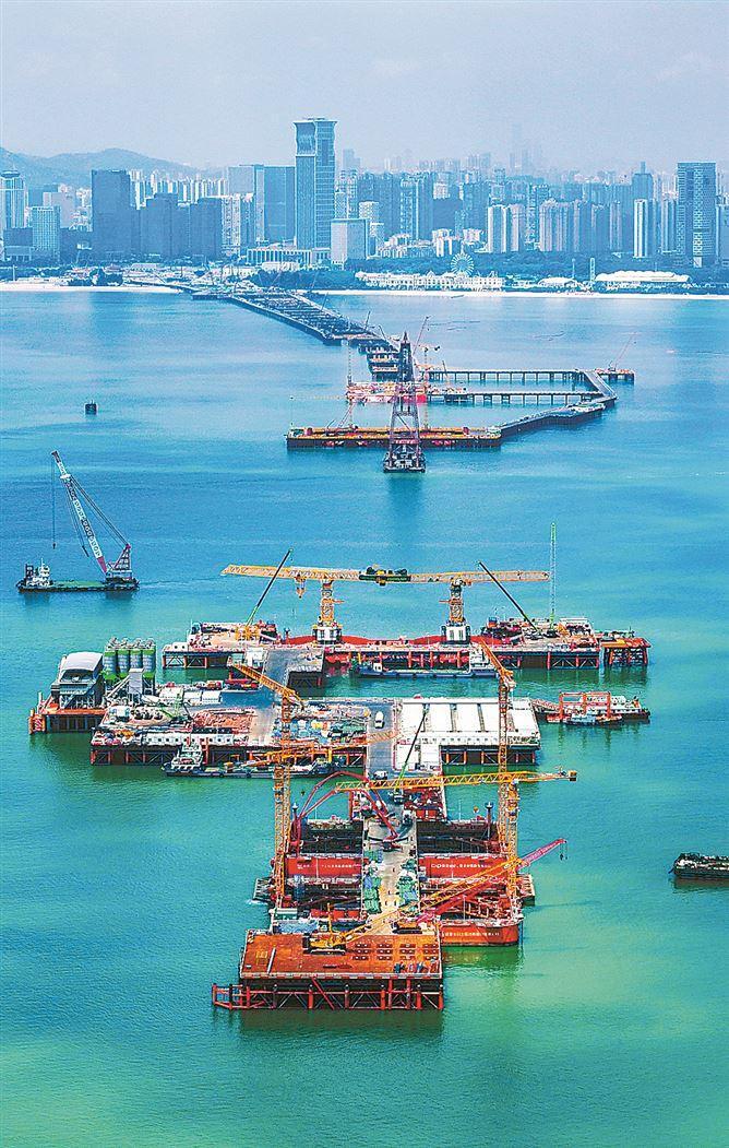 厦金大桥(厦门段)是厦门本岛连接翔安的第三条大通道。图为刘五店航道桥今年6月施工现场。 (本报记者 王火炎 摄)