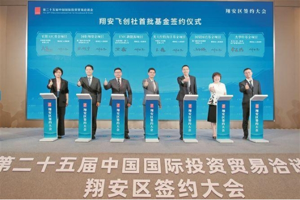 这座见证着翔安区跨越式发展、承载着产城融合梦想的现代化场馆,正成为商机汇聚的舞台——一笔笔签约勾勒产业蓝图,一次次携手共筑发展基石,一场场洽谈涌动创新活力。新能源新材料、半导体和集成电路、生物医药、航空临空、基金……今年投洽会期间,翔安区累计对接项目超1000亿元。其中,省级签约项目3个,总投资200亿元;区级上台签约项目44个,总投资304亿元。它们是翔安区“4+3+3”现代化产业体系加速成型的鲜活注脚,更是驱动区域高质量发展的澎湃动能。