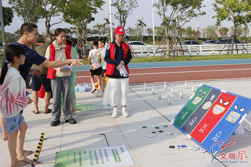 趣味游戏互动区更是人头攒动,多款融入文明理念的游戏让大家在欢笑中学习知识。“打掉不文明行为”中,参与者挥锤击碎印有“乱扔垃圾”“践踏草坪”等图案的泡沫模型,释放对不文明行为的抵制;“飞盘投文明”里,大家瞄准印有文明行为的网兜投掷,在竞技中强化文明意识;“垃圾分类大挑战”通过投掷对应类别垃圾沙包,帮助市民巩固露营垃圾分类知识;“文明向前冲”“文明大富翁”等游戏则将团队协作、知识问答与文明行为认知相结合,让参与者在轻松氛围中深化对文明露营的理解。