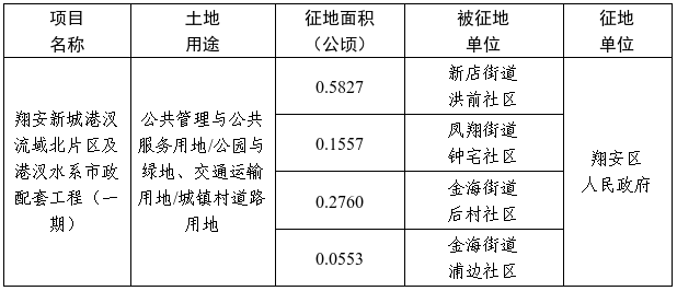 厦门市翔安区人民政府关于翔安新城港汊流域北片区及港汊水系市政配套工程(一期)项目土地征收的公告