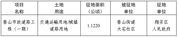 厦门市翔安区人民政府关于香山市政道路工程(一期)项目土地征收的公告