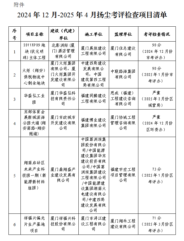 2024年12月-2025年4月市城市综合管理考评委员会办公室、市生态环境保护委员会办公室、区城市综合管理考评委员会办公室、区生态环境保护委员会办公室、区建设与交通工程质量安全站相继对我区建筑工地开展在建工地扬尘防治考评检查。综合各有关部门考评检查情况,根据《厦门市翔安区建设与交通局关于印发房屋建筑和市政基础设施工程文明施工扬尘防治工作方案(2023年修订)的通知》(厦翔建〔2023〕37号)有关要求,经研究,决定对被考评项目作出以下处理: