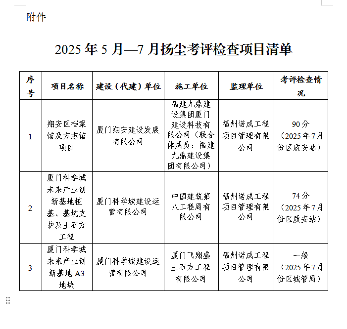 2025年5月-7月区城市管理和综合执法局、区生态环境保护委员会办公室、区建设与交通工程质量安全站相继对我区建筑工地开展在建工地扬尘防治考评检查。综合各有关部门考评检查情况,根据《厦门市翔安区建设与交通局关于印发房屋建筑和市政基础设施工程文明施工扬尘防治工作方案(2023年修订)的通知》(厦翔建〔2023〕37号)有关要求,经研究,决定对被考评项目作出以下处理: