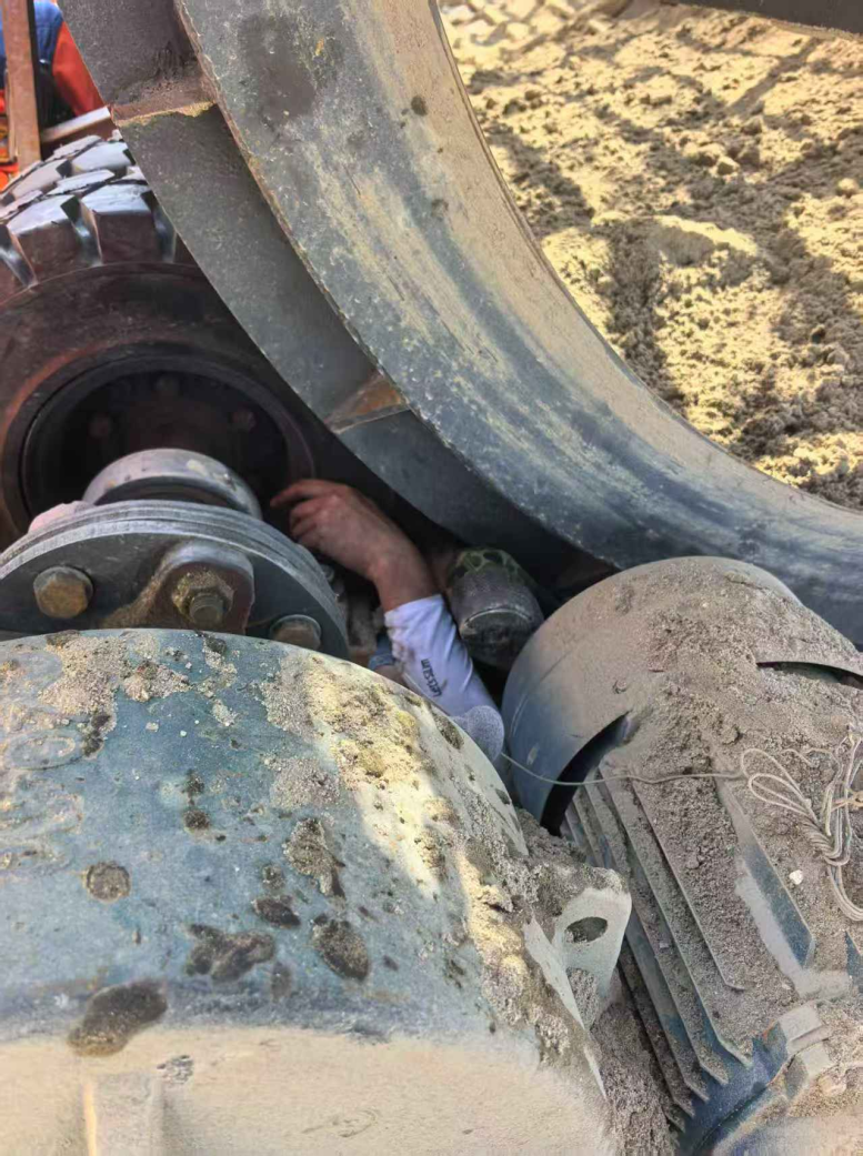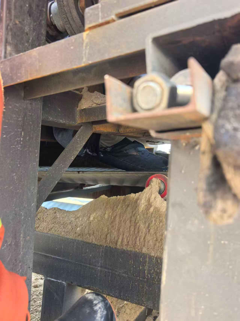 图6 救援现场朱*庆被卷入,“卡”在筛砂机滚筒与传送带