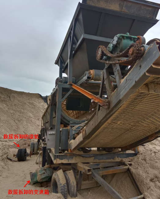 1.事发现场停放1台筛砂机,筛砂机旁放置1个轮胎、1副变速箱,为救援朱*庆时从“筛砂机”上拆卸下来;