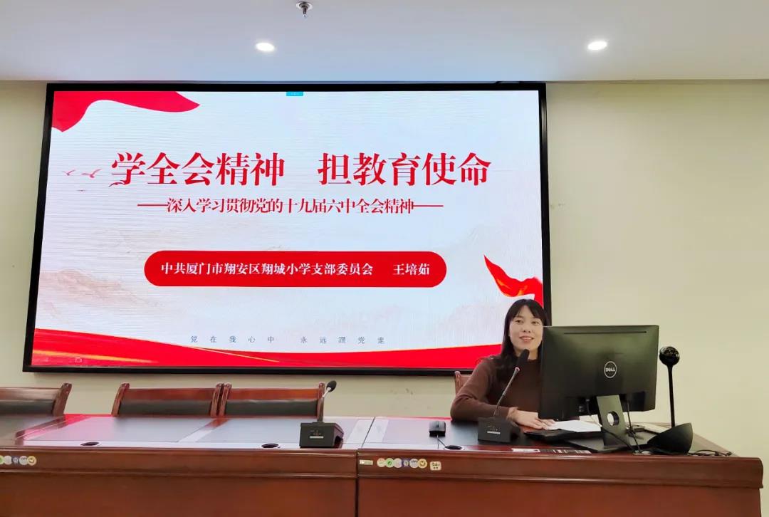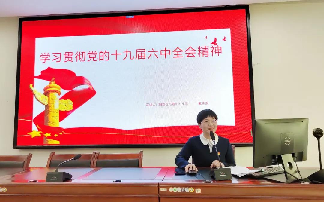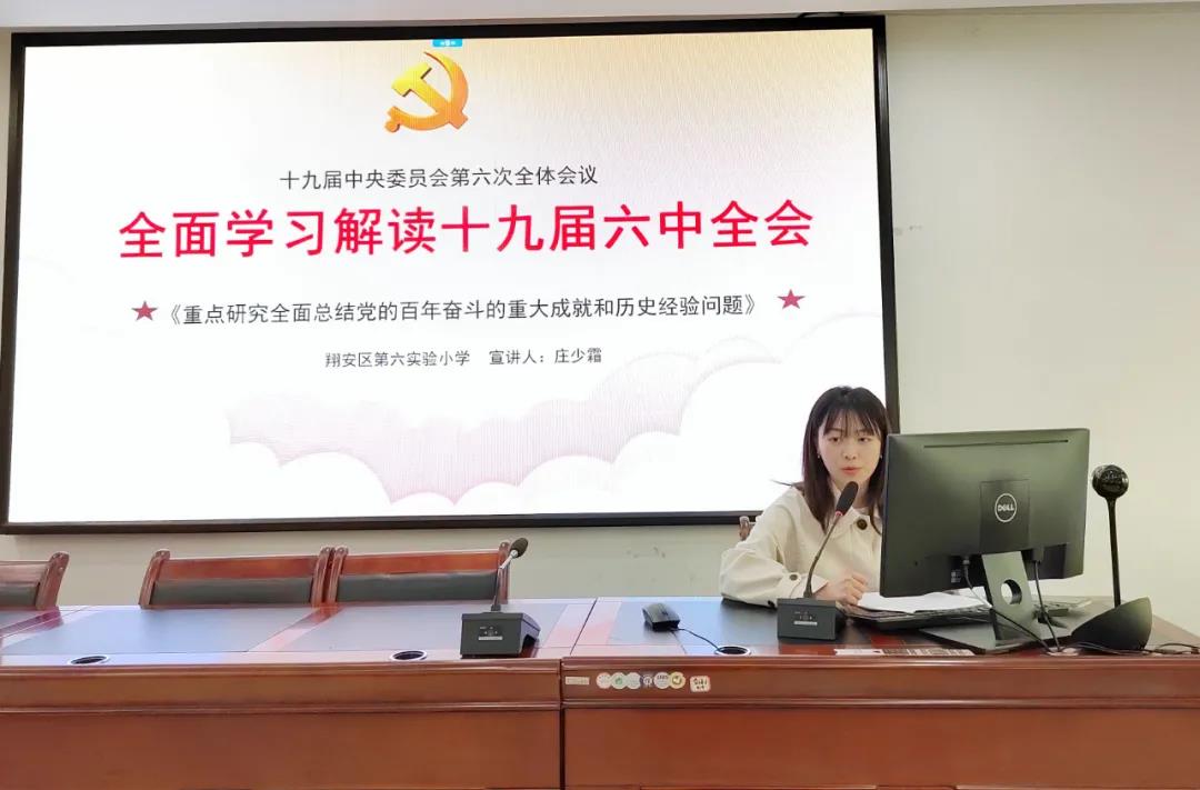 翔安区第六实验小学二级教师庄少霜,从党的十九届六中全会概况、十九届六中全会召开的重要意义、十九届六中全会看点、认真学习贯彻六中全会精神四个方面,全面学习解读十九届六中全会。